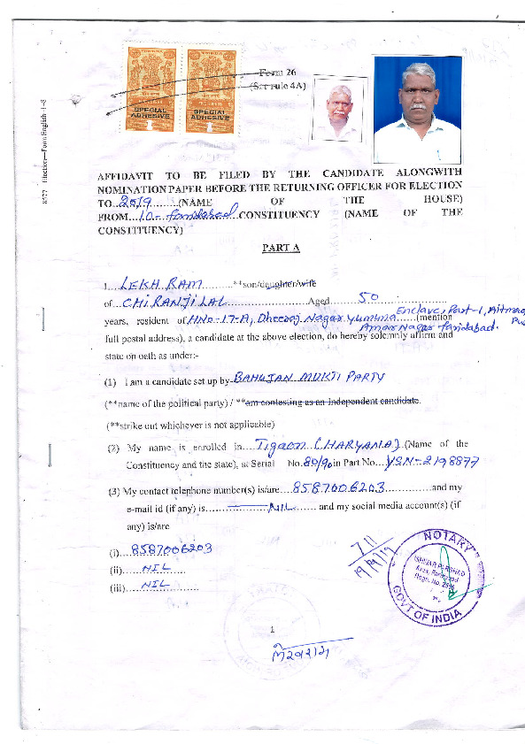| அரியானா | பரீதாபாது | Sunday, 12 May 2019 | Lekha Ram Dabang(Affadavit) | Krishan Pal |