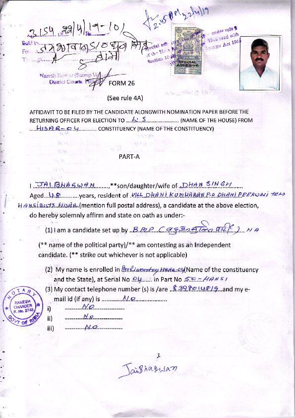 | அரியானா | Hisar | Sunday, 12 May 2019 | Jai Bhagwan(Affadavit) | Brijendra Singh |