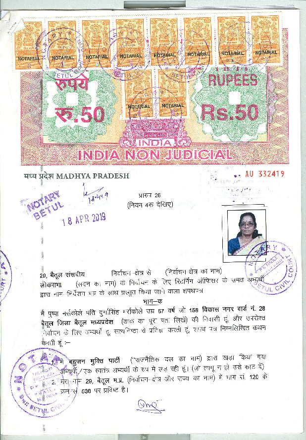 | மத்தியப் பிரதேசம் | Betul | Monday, 6 May 2019 | Pushpa Marskole(Affadavit) | Durga Das (d.d.) Uikey |