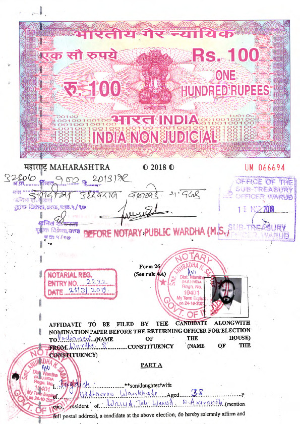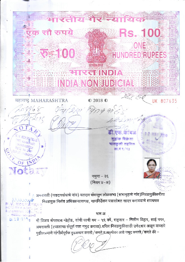 | மகாராட்டிரம் | அமராவதி (மகாராட்டிரம்) | Thursday, 18 April 2019 | Mohod Panchshila Vijay(Affadavit) | Navnit Ravi Rana |