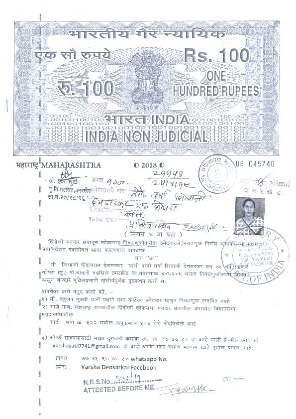 | மகாராட்டிரம் | Hingoli | Thursday, 18 April 2019 | Varsha Shivajirao Devsarkar(Affadavit) | Hemant Patil |