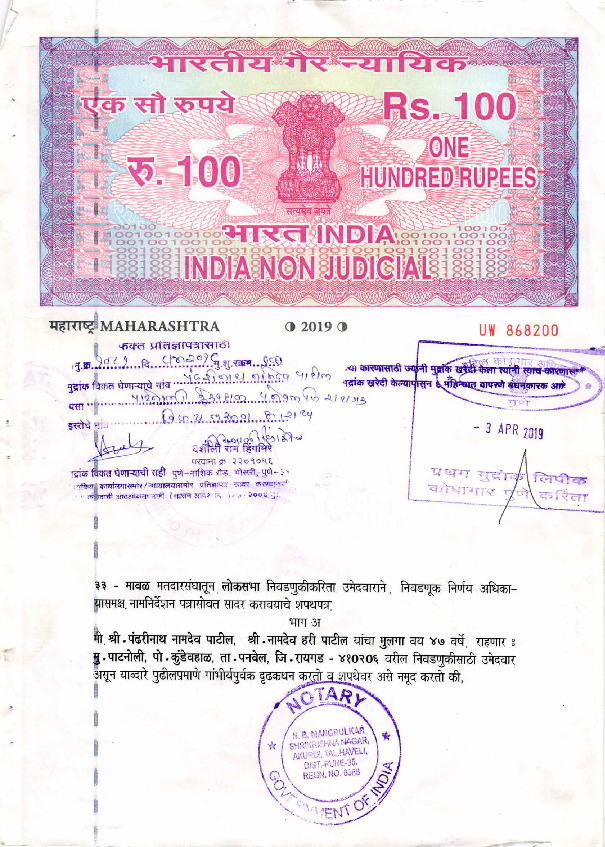 | மகாராட்டிரம் | Maval | Monday, 29 April 2019 | Pandharinath Namdeo Patil(Affadavit) | Shrirang Appa Chandu Barne |
