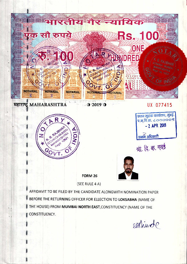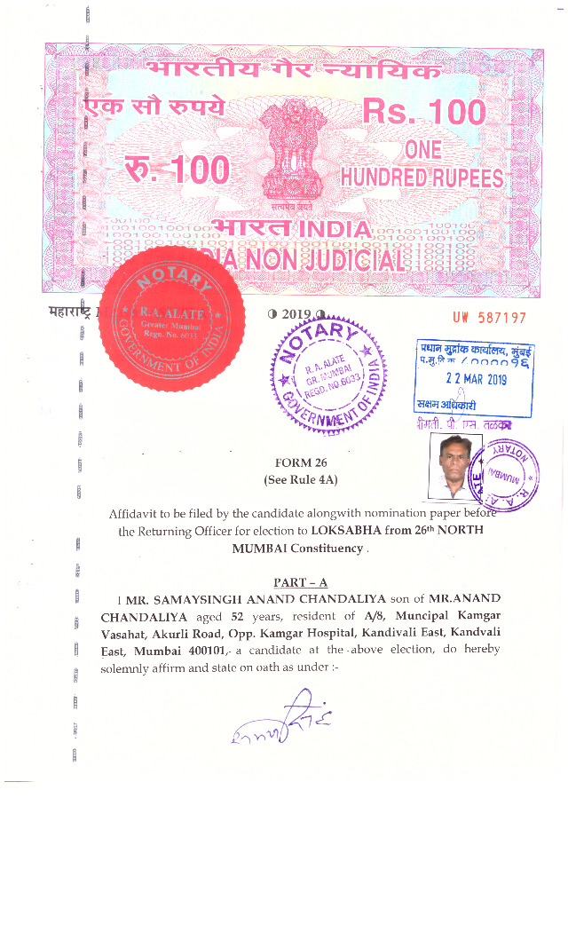 | மகாராட்டிரம் | Mumbai North | Monday, 29 April 2019 | Chandaliya Samaysingh Anand(Affadavit) | Gopal Shetty |