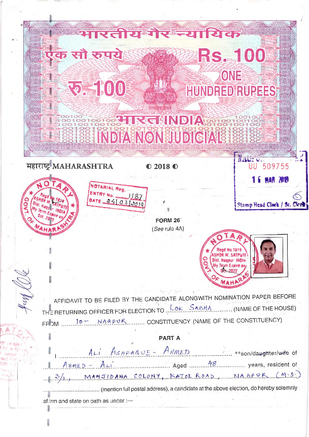 | மகாராட்டிரம் | நாக்பூர் | Thursday, 11 April 2019 | Ali Ashfaque Ahmed(Affadavit) | Nitin Jairam Gadkari |