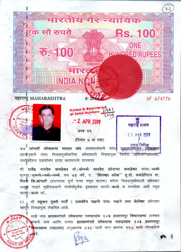 | மகாராட்டிரம் | சாங்கலி | Tuesday, 23 April 2019 | Rajendra Namdev Kavthekar(Affadavit) | Sanjaykaka Patil |