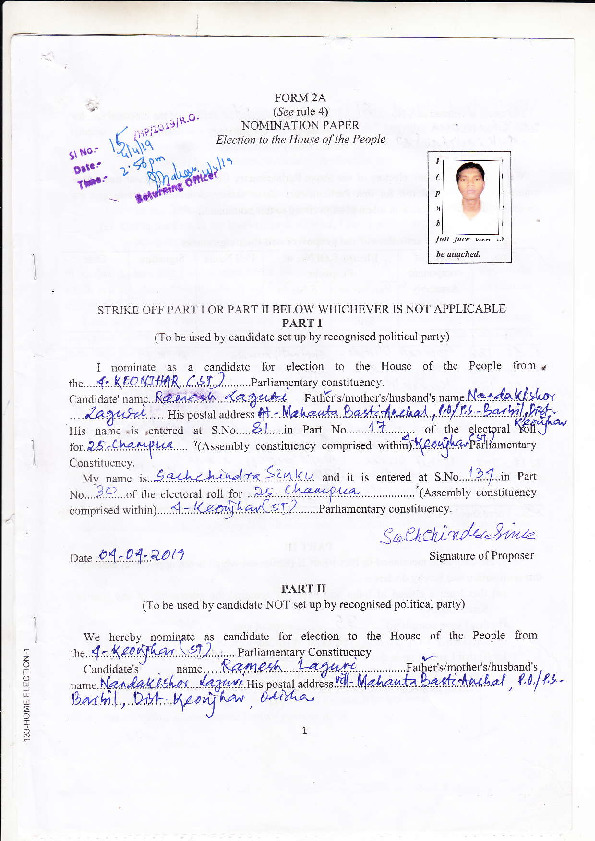 | ஒடிசா | Keonjhar | Tuesday, 23 April 2019 | Ramesh Laguri(Affadavit) | Chandrani Murmu |