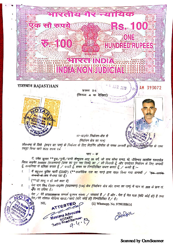 | ராஜஸ்தான் | Barmer | Monday, 29 April 2019 | Ramesh Kumar(Affadavit) | Kailash Choudhary |