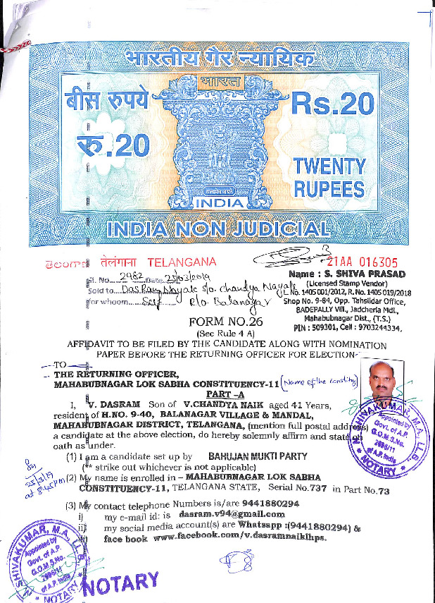 | தெலங்காணா | Mahabubnagar | Thursday, 11 April 2019 | V Dasram(Affadavit) | Reddy,shri A.p. Jithender |