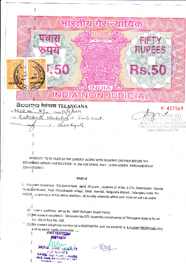 | தெலங்காணா | நல்கொண்டா | Thursday, 11 April 2019 | Katravath Venkatesh(Affadavit) | Gutha,shri Sukender Reddy |