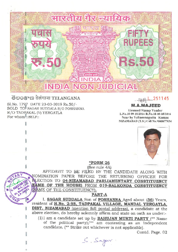 | தெலங்காணா | Nizamabad | Thursday, 11 April 2019 | Sagar Suddala(Affadavit) | Kalvakuntla,smt. Kavitha |