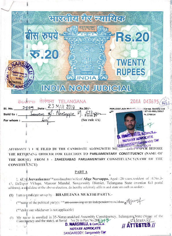 | தெலங்காணா | Zahirabad | Thursday, 11 April 2019 | Alige Jeevan Kumar(Affadavit) | Patil,shri Bheemrao Baswanthrao |