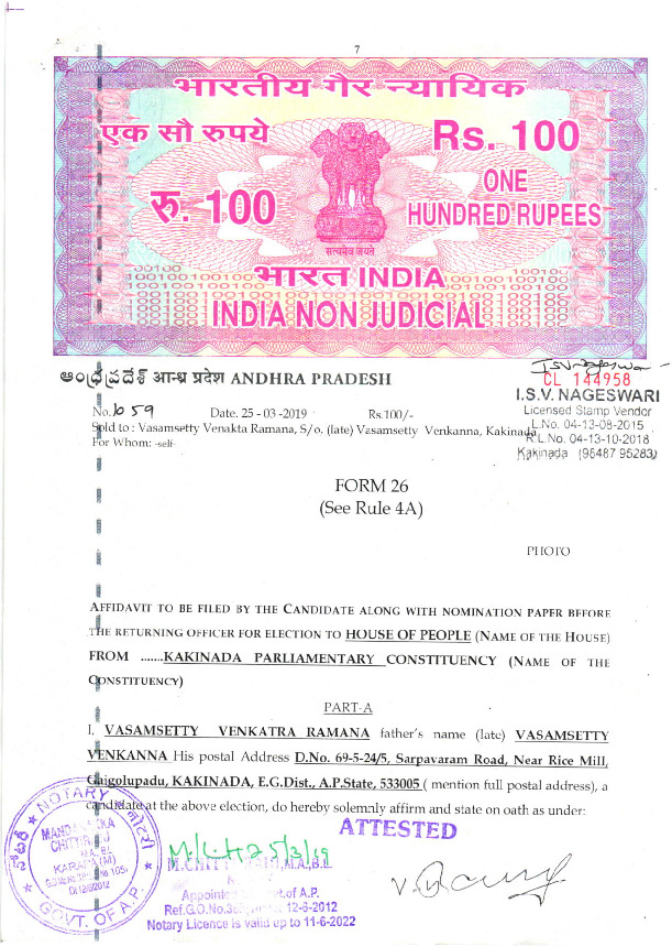 | ఆంధ్ర ప్రదేశ్ | కాకినాడ | Thursday, 11 April 2019 | Vasamsetty Venaktaramana(Affadavit) | Vanga Geethaviswanath |
