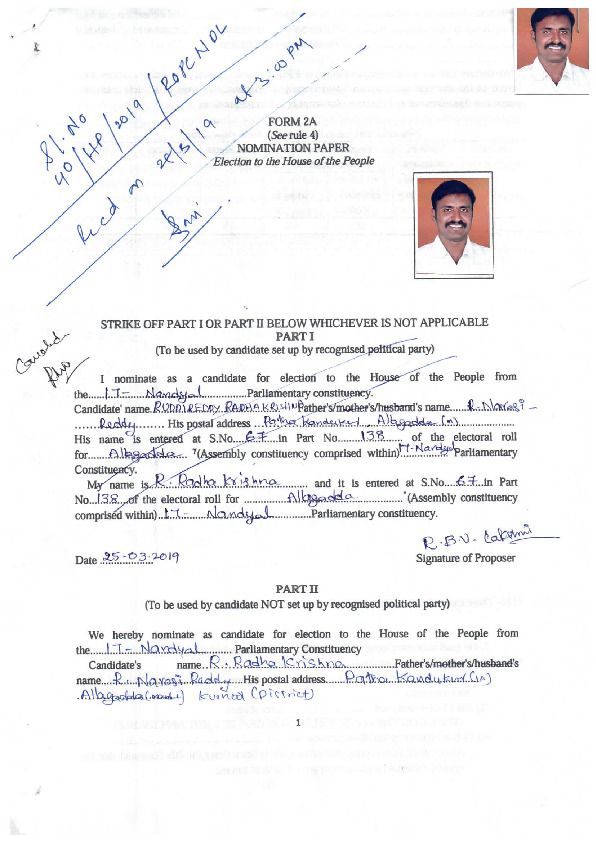 | ఆంధ్ర ప్రదేశ్ | నంద్యాల | Thursday, 11 April 2019 | R. Radha Krishna(Affadavit) | Pocha . Brahmananda Reddy |