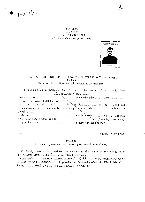 | అరుణాచల్ ప్రదేశ్ | Arunachal West | Thursday, 11 April 2019 | Jomin Nyokir Kara(Affadavit) | Kiren Rijiju |
