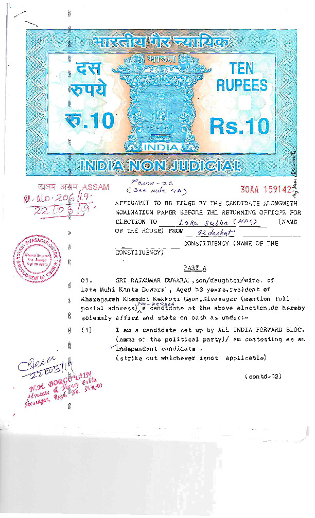| అసోం | జోర్హాట్ | Thursday, 11 April 2019 | Raj Kumar Duwara(Affadavit) | Topon Kumar Gogoi |