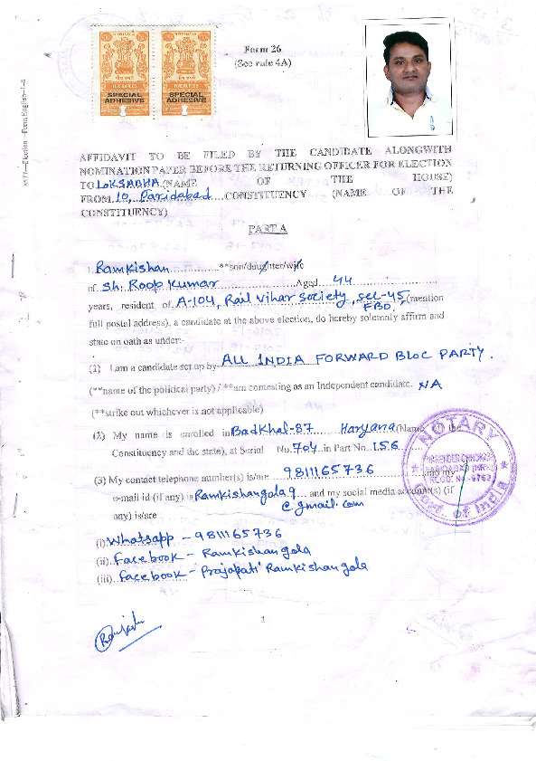 | హర్యానా | ఫరీదాబాద్ | Sunday, 12 May 2019 | Ram Kishan Gola(Affadavit) | Krishan Pal |