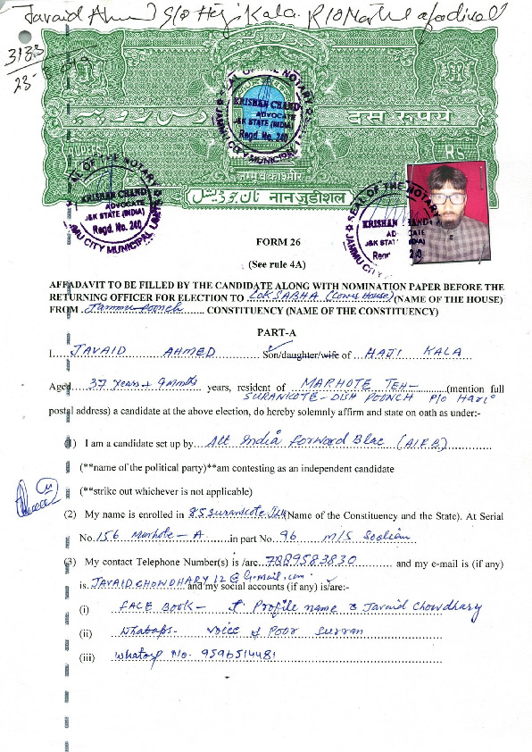 | జమ్మూ కాశ్మీరు | Jammu | Thursday, 11 April 2019 | Javaid Ahmed(Affadavit) | Sharma,shri Jugal Kishore |