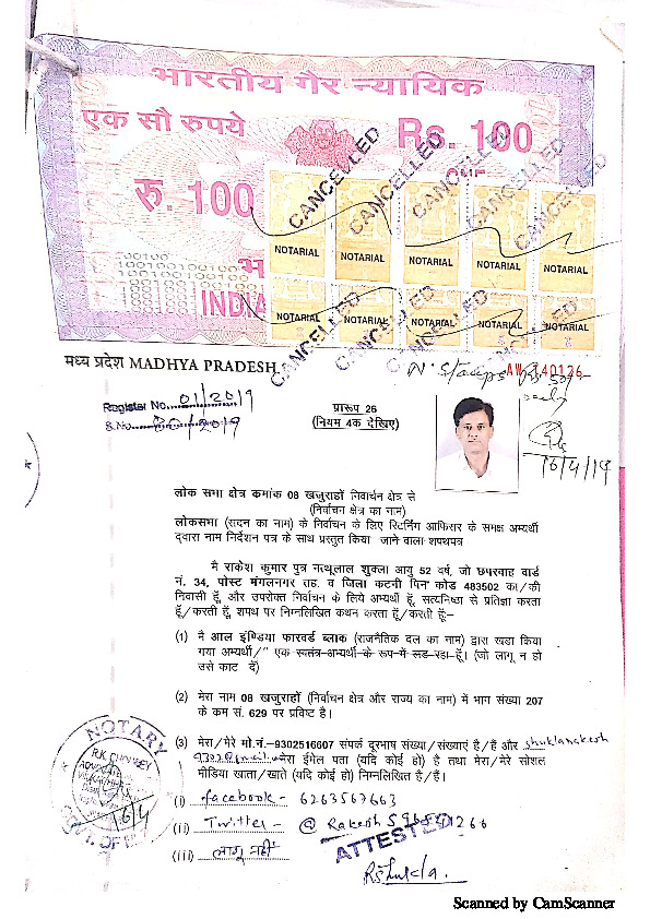 | మధ్య ప్రదేశ్ | Khajuraho | Monday, 6 May 2019 | Advocate Rakesh Kumar Shukla(Affadavit) | V.d. Sharma (vishnu Datt Sharma) |