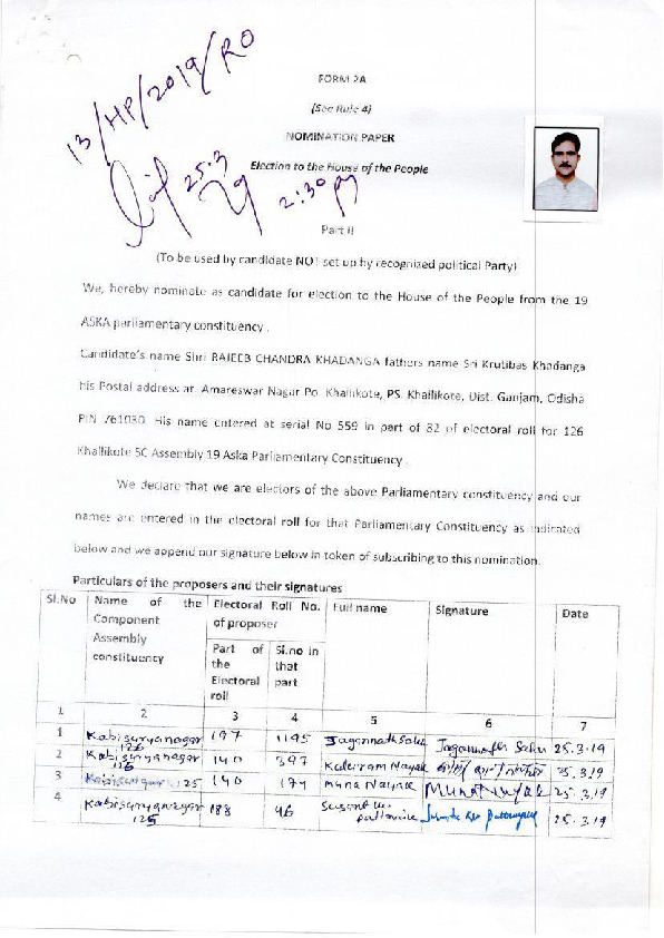 | ఒడిషా | Aska | Thursday, 18 April 2019 | Rajeeb Chandra Khadanga(Affadavit) | Pramila Bisoyi |