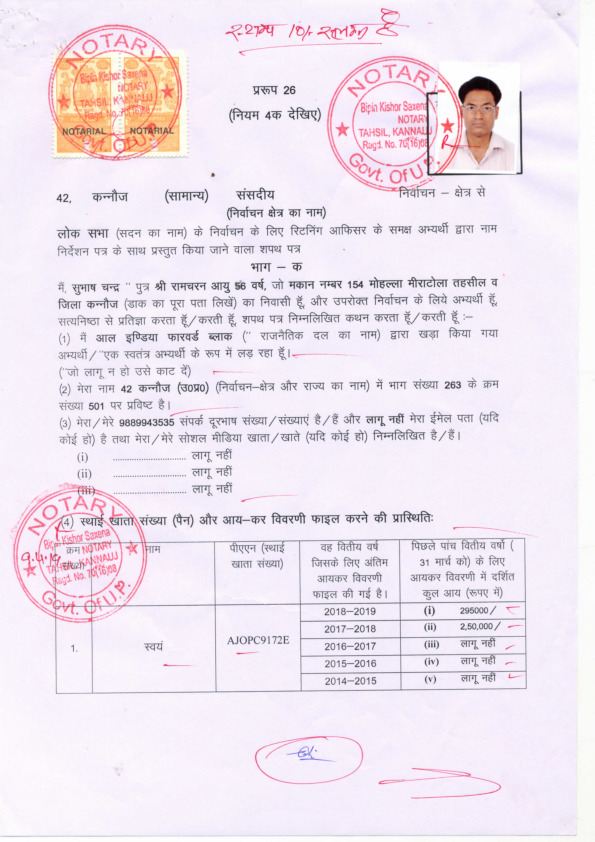 | ఉత్తర ప్రదేశ్ | Kannauj | Monday, 29 April 2019 | Subhash Chandra Dohre(Affadavit) | Subrat Pathak |