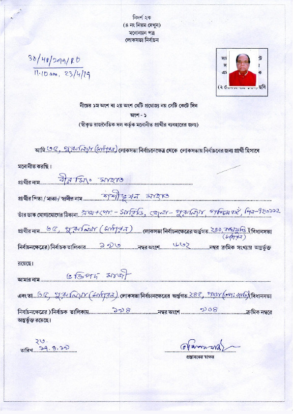 | పశ్చిమ బెంగాల్ | Purulia | Sunday, 12 May 2019 | Bir Singh Mahato(Affadavit) | Jyotirmay Singh Mahato |